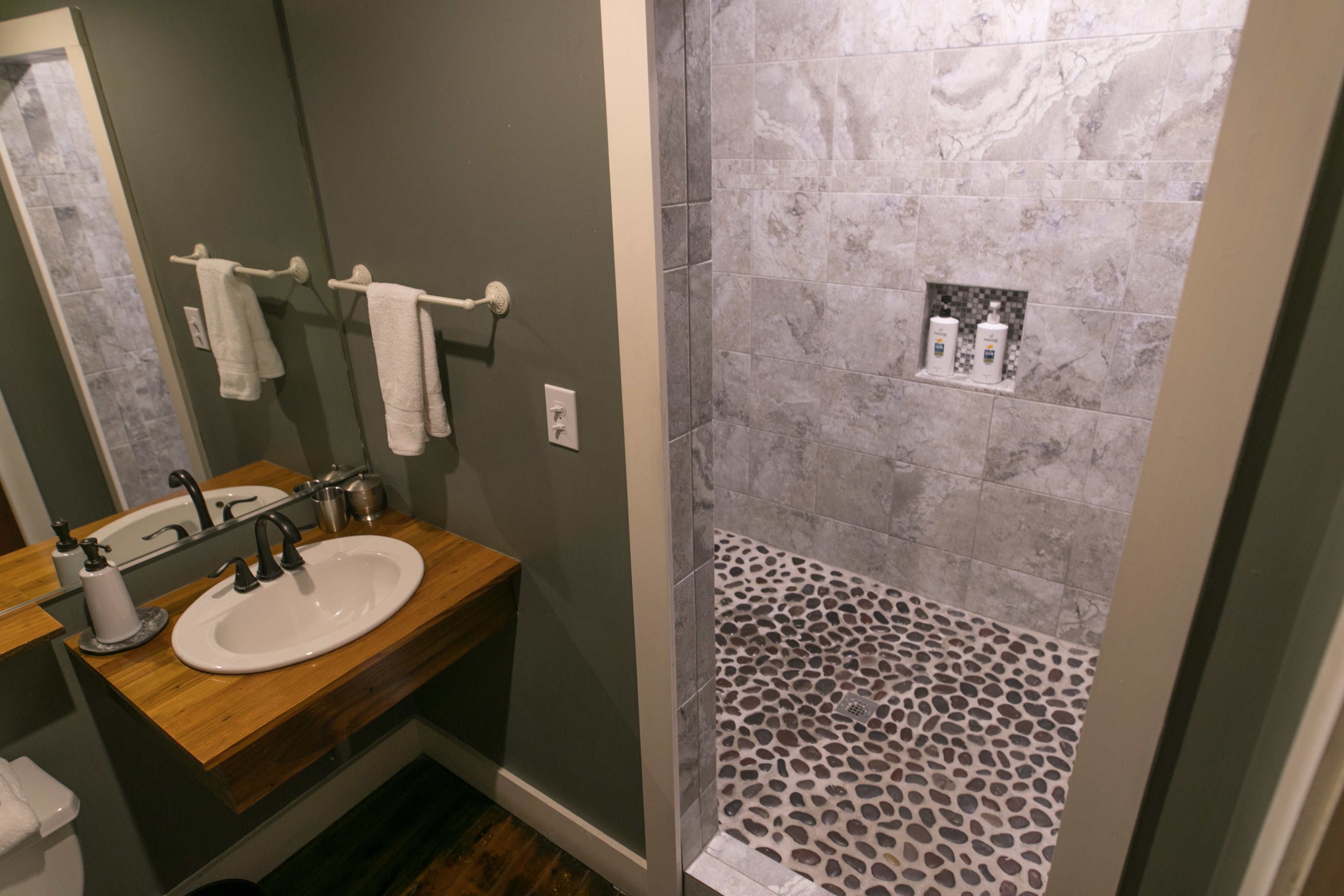 The apartment offers two bedrooms, each with a queen bed, a cozy social dining area with a kitchenette, and a spacious river-rock rain shower. Linens, towels, and soap are provided.
